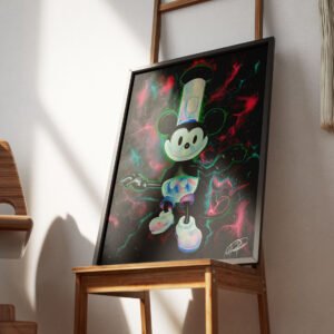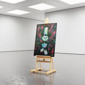 Este cuadro reinterpreta a Mickey Mouse, ícono global de la cultura pop, desde una mirada contemporánea que fusiona pintura tradicional con tecnología inmersiva.