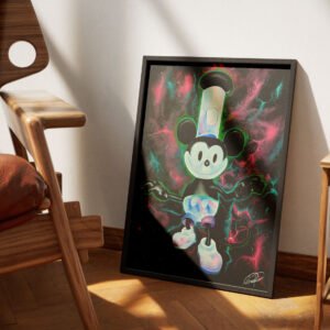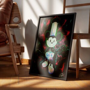 El uso de RA no solo es decorativo, sino que transforma el cuadro en una experiencia interactiva, donde lo nostálgico y lo futurista se entrelazan. Este Mickey no solo nos mira desde la pintura: nos invita a cruzar el umbral entre lo tangible y lo digital, entre el recuerdo y la innovación.